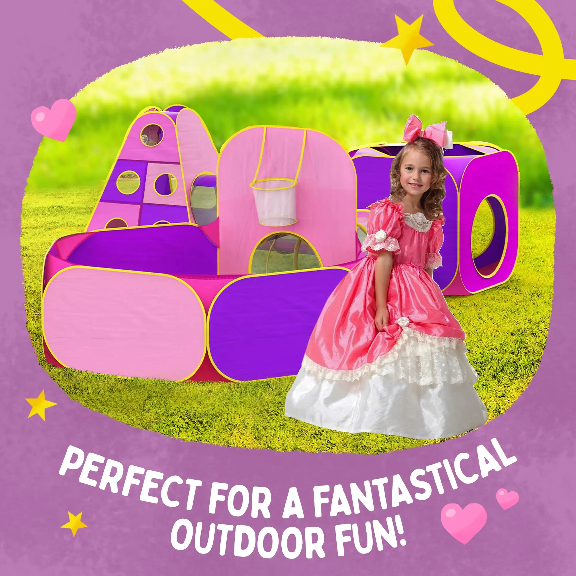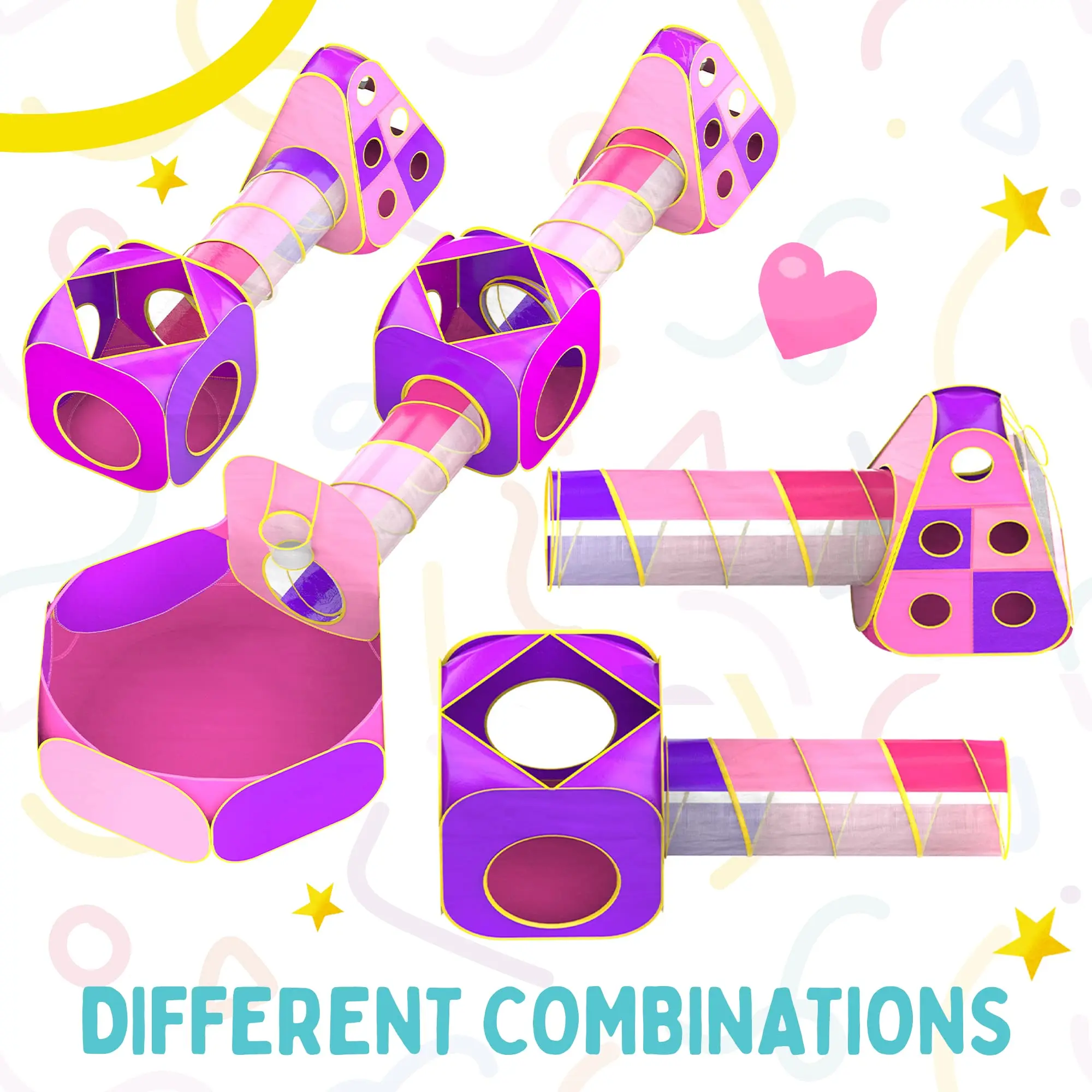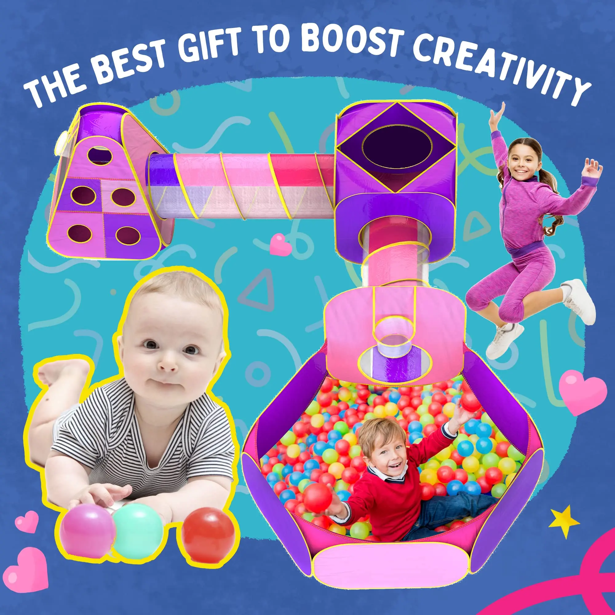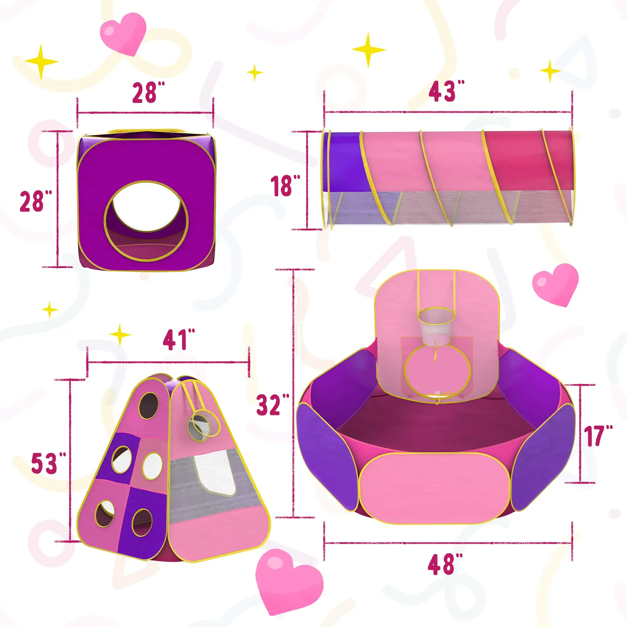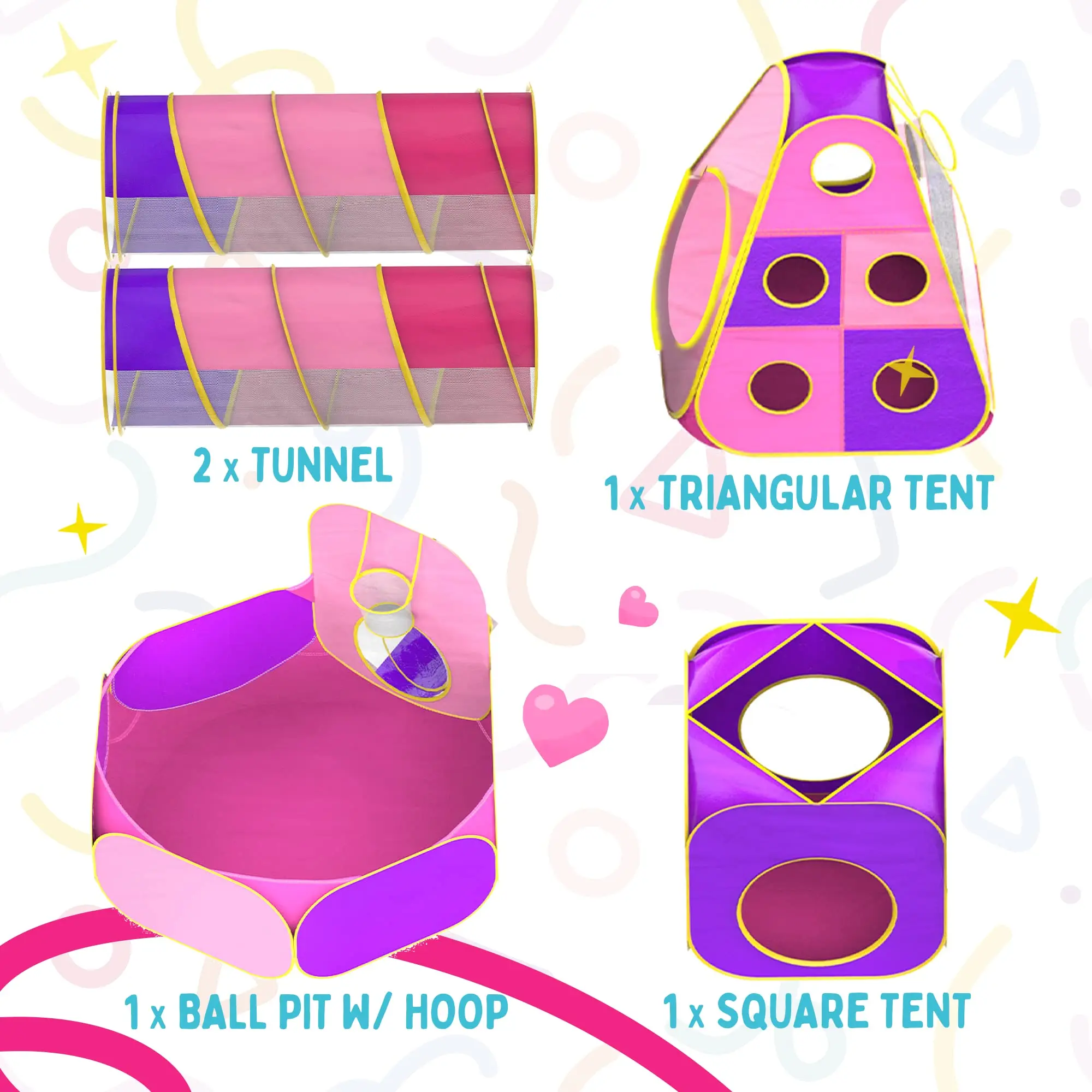 Introducing, the Sansu Playhouse Popup Tent Canopy for Kids! This 5-piece set includes a castle hideout, ball pit, and tunnels that will provide endless hours of fun and imagination for your little ones.